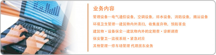 实行有关建筑物的法定检查等,进行检查人员的安排及管理。另外,也施行电梯保守检查 ,日常清扫,消防设备检查,定期清扫各种水泵,对一般废弃物进行处理,清扫储水槽,高架水槽, 机器报警器,监控器。